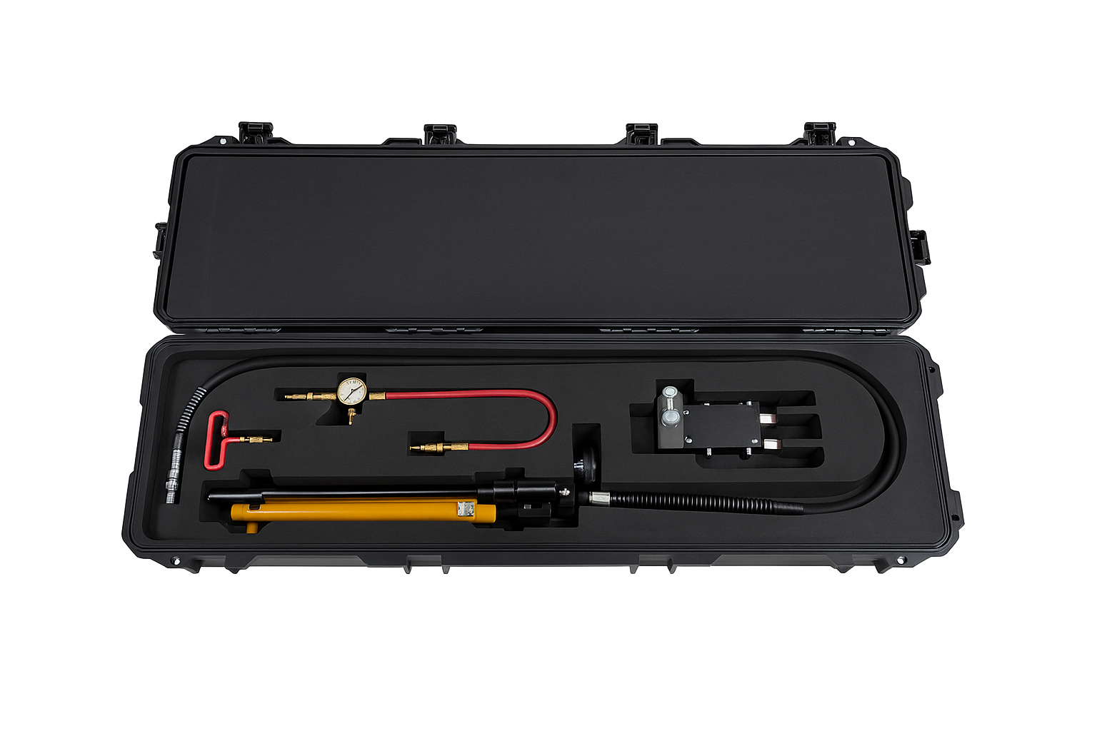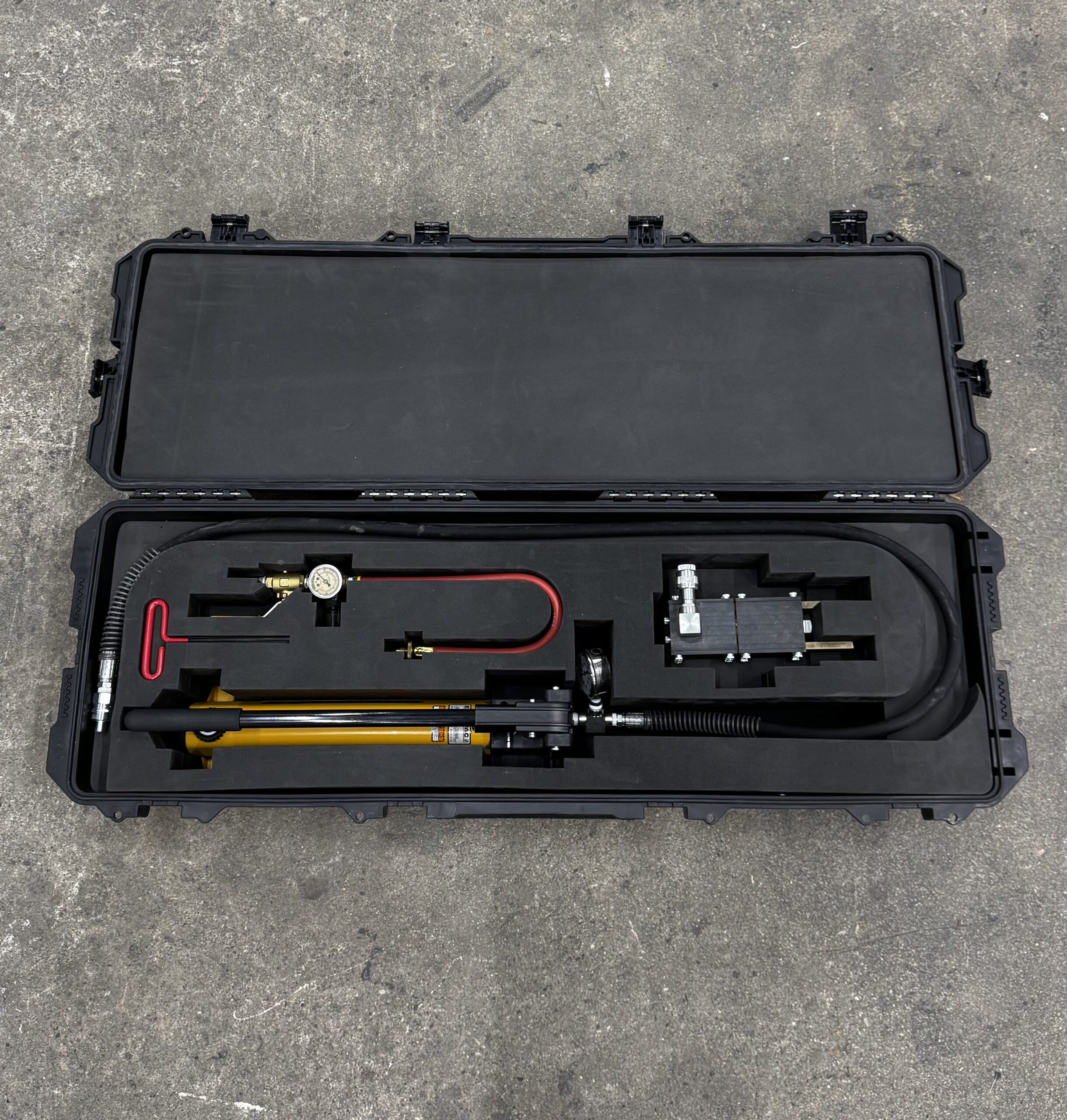 WEKO-SEAL Hydraulic Installation Expander Head with Pump, Gauge and Air Test Assembly, Securely Placed in Portable Pelican Case with Rolling Wheels, Handle, and Custom Foam Insert for tools.